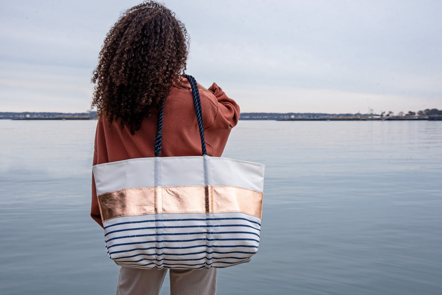 Don't be fooled by the delicate beauty of rose gold this tough, oversized bag is ready to carry all you need for weekends and family outings. Inspired by the days on the water and shimmering seashells, we created this stunning take on classic Breton stripes. A luminous band of rose gold, in metallic leather, adds the perfect touch. Add your initials for a custom upgrade that's the ultimate in nautical chic.