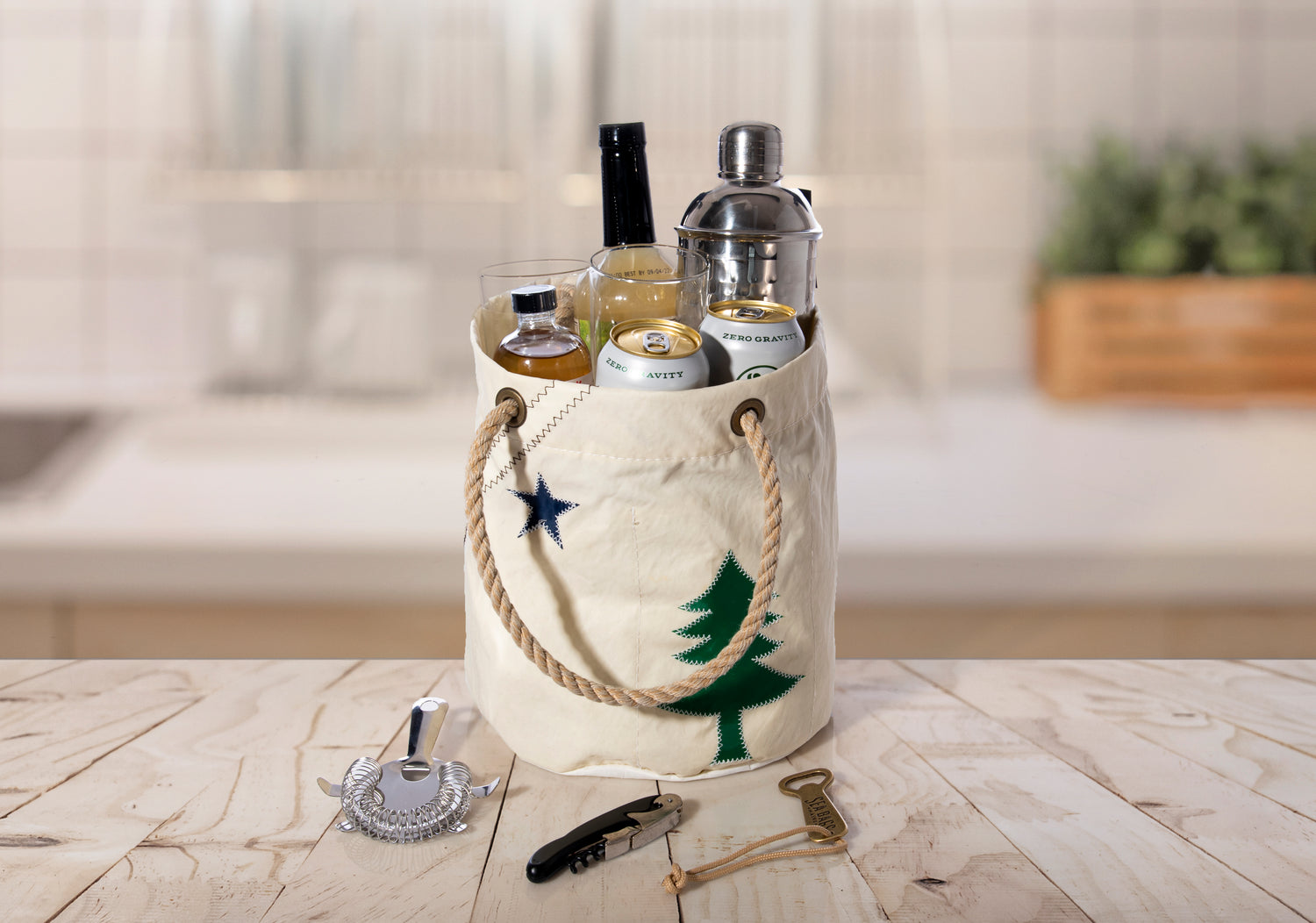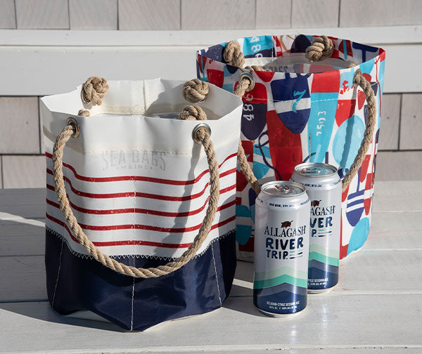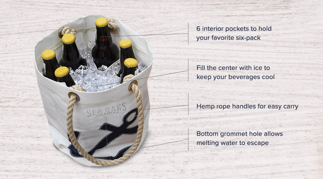 Customers love our Beverage Bucket Bag for tailgating, trips to the beach, or days on the boat. This versatile bag features six interior pockets sized to hold a six-pack of your favorite beverage. Fill the center with ice and you've got a perfect collapsible cooler. Melting ice escapes through a grommet hole in the base of the water-resistant recycled sail cloth. When not being used as a beverage tote, use it to hold and organize tools, crafts, or toiletries. Or use it to display plants and flowers or a creative centerpiece; the possibilities are endless!