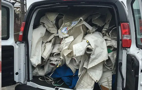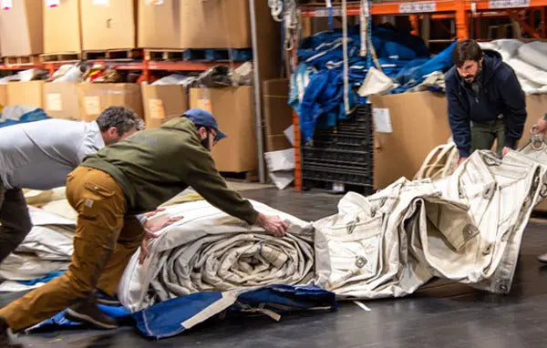 We plan for a full load of sails before each lot heads back to Maine. At our warehouse, we begin the process of washing and organizing the sails to be made into bags.