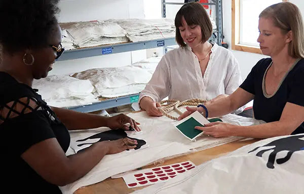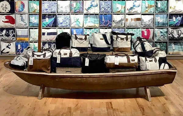 Our design team is always hard at work dreaming up the next fan-favorite design or bag shape. Planning designs for each season starts months in advance, poring through our collection of sails, evaluating how we can highlight textures and stitching that makes each sail uniquely beautiful. Then our team selects the component pieces like New England-made rope, responsibly produced leather, and colorful canvas to best accentuate the design and innate sail qualities.