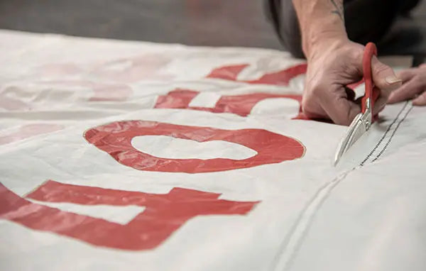 Each sail is laid out and meticulously templated by hand to minimize material waste. We start with any notable numbers or insignias; we call this the "sweet spot" of the sail and reserve those panels first to be used in our vintage bags. Then we template the rest of the sail and cut panels by hand.