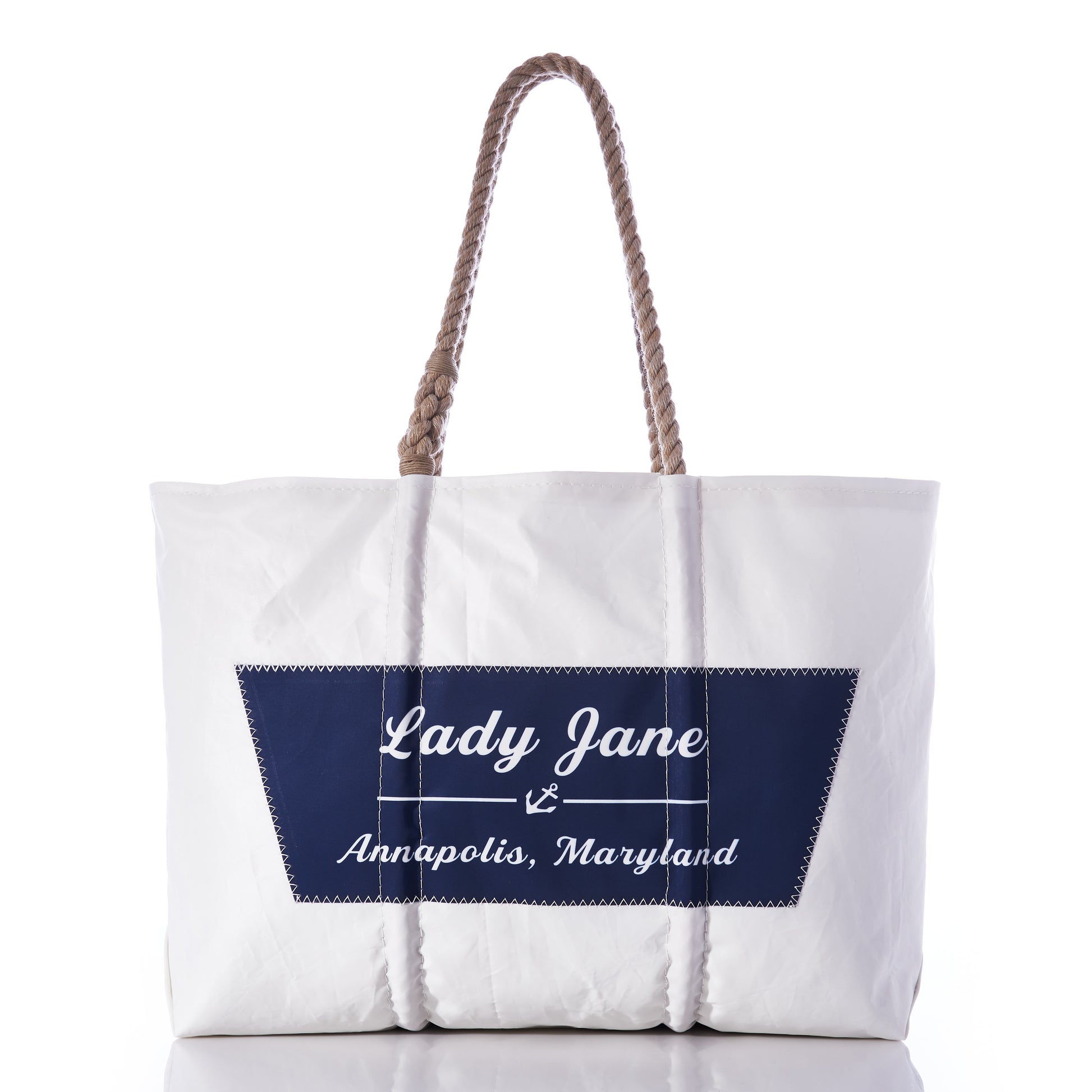 The art of naming one's boat is a thoughtful endeavor. It's a silent narrative of adventure, a name that anchors memories of days peacefully adrift, a name shared amongst those lucky enough to board a beloved vessel. Whether it's your boat or one you had a single fond experience on, this tote will keep those memories close. Now available in this classic, all caps font for a sleek and simple look.