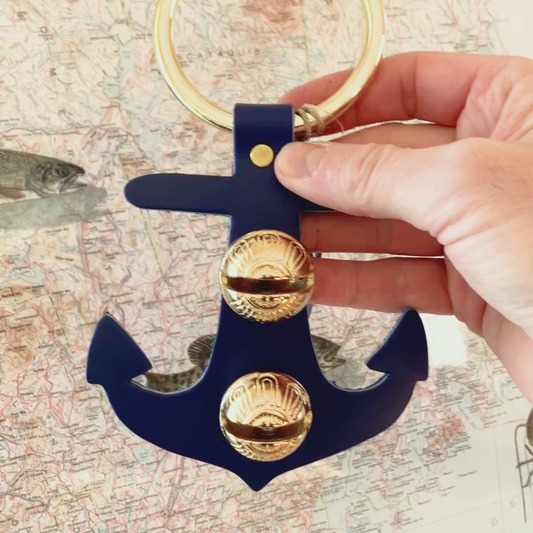 Featuring a nautical Anchor, this designer door chime is stamped out of authentic leather and adorned with two jingling brass bells. The brass ring allows you to hang it on a doorknob to announce your arrival in style. Approx. 4" wide and 7" high overall. Made in USA by New England Bells.