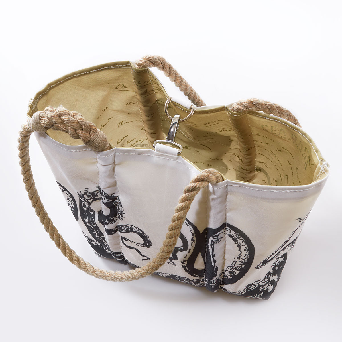 This dramatic Octopus Handbag features an illustration inspired by one of the most mysterious creatures of the sea. Our octopus is printed with ink as dark as his own; on sails that have known the sea. The lining is inspired by Charles Darwin's handwritten notes from The Origin of Species, for another layer of intrigue. Printed on recycled sail cloth.