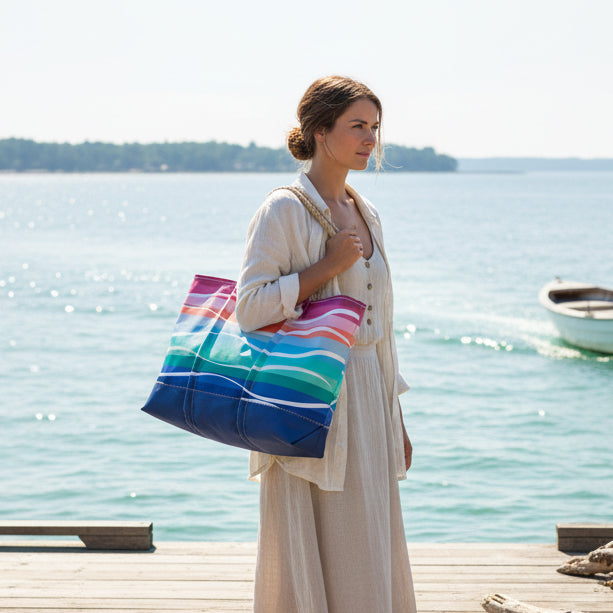 Always have space for everything you need, no matter how many hours you spend at the beach. Pockets inside and out, keep you organized, and wet items separate, with durable hand-spliced rope handles to haul it all. Inspired by coastal sunsets dipping over the horizon, this design is an homage to nature’s intricate palette of wavy blue, pink, and orange hues.