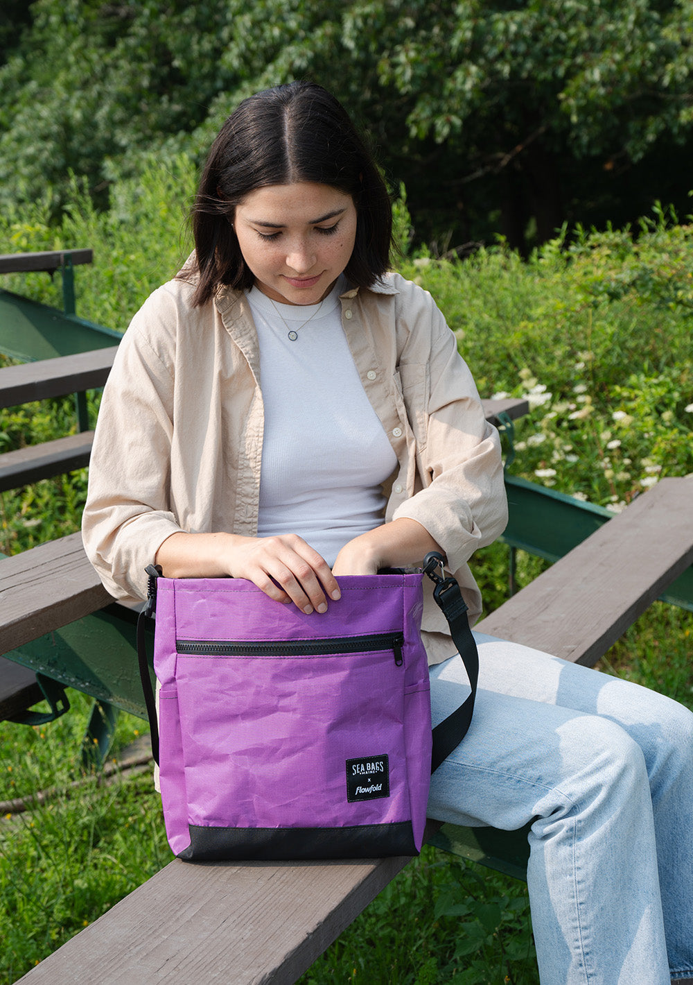 Carry this one-of-a-kind sustainable crossbody bag developed in partnership with Flowfold®. Each ultra durable pack is made from Sea Bags vintage recycled sail cloth and lined with 100% Repreve® recycled polyester ripstop fabric. This highly functional bag features two interior slip pockets to organize small items, an exterior zipper pocket for easy access to frequently used essentials, and two side pockets. Finished with a reinforced bottom and adjustable shoulder strap, this Vintage Blue Letters Medium Voyager Crew Crossbody is ready for your next adventure.