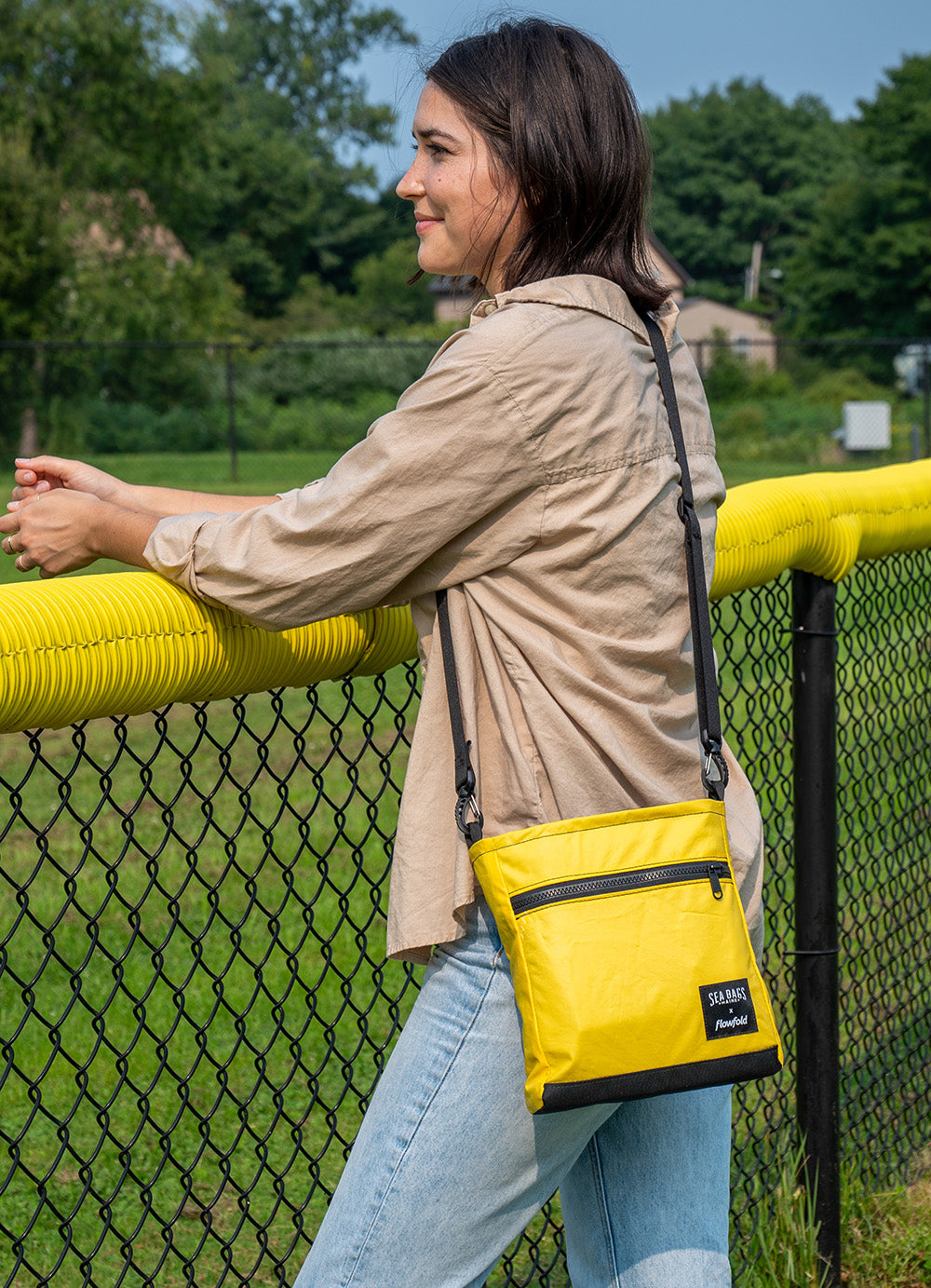 Carry this one-of-a-kind sustainable crossbody bag developed in partnership with Flowfold®. Each ultra durable pack is made from Sea Bags vintage recycled sail cloth and lined with 100% Repreve® recycled polyester ripstop fabric. This highly functional bag features a spacious main compartment, two exterior zipper pockets for easy access to frequently used essentials, and an interior key clip. Finished with a reinforced bottom and adjustable shoulder strap, this Vintage Blue and Yellow Small Voyager Crew Crossbody is ready for your next adventure.