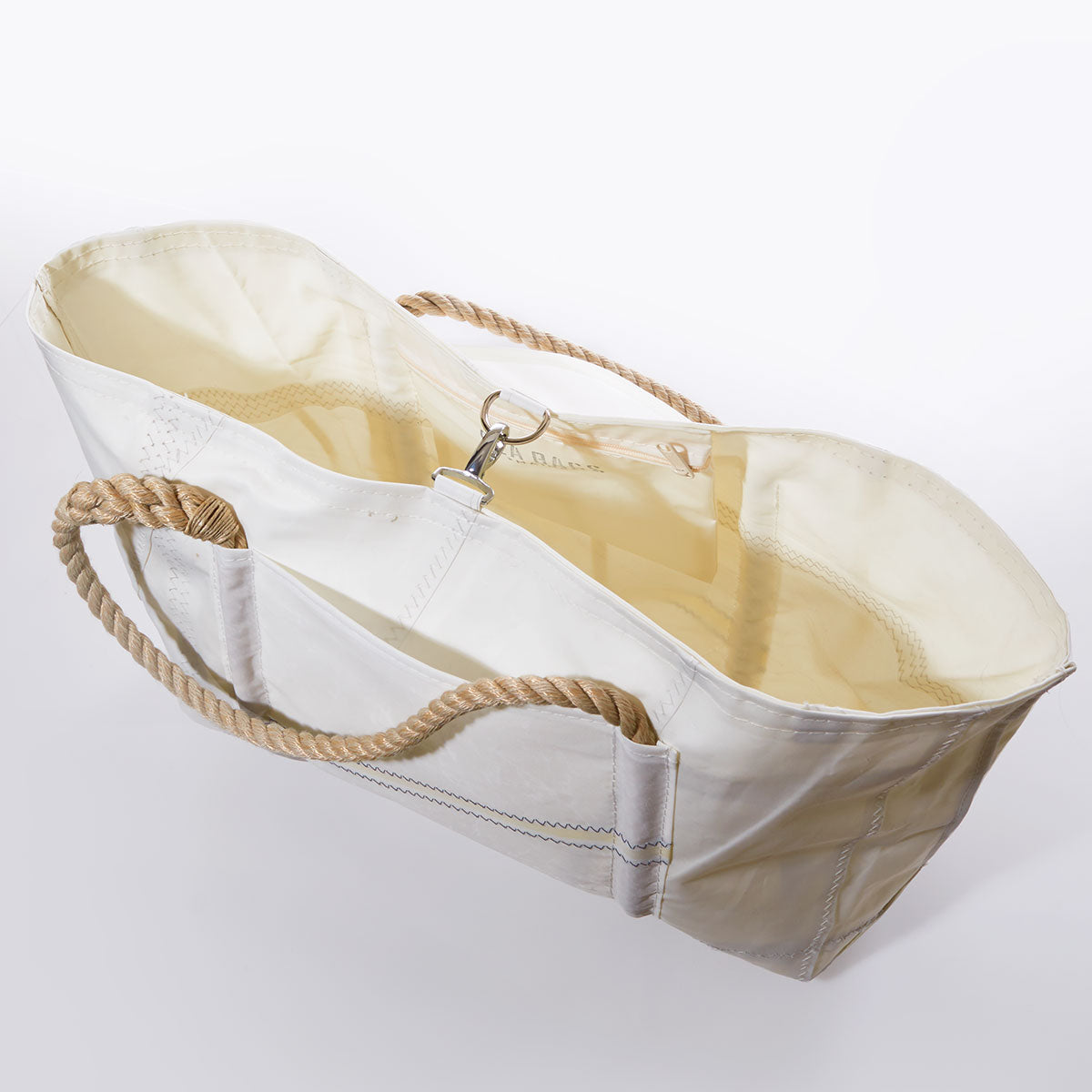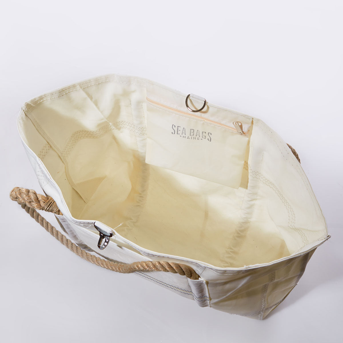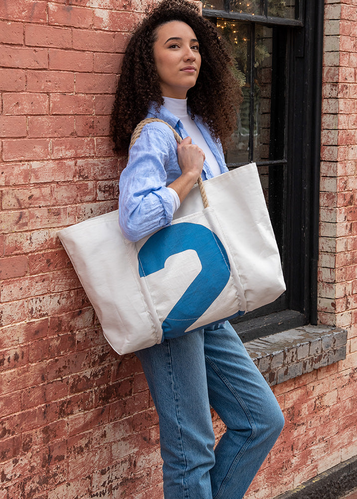 The very first tote we ever stitched was this sturdy design—the same as used by a local fisherman for decades. Our original is close to our hearts and we found a way to make it even more special. The generous, wraparound pocket is made from the coveted insignia from recycled sail. Two Sea Bags originals come together to create a classic that’s earth-friendly and one-of-a-kind. Featuring hand-spliced rope handles and a clasp closure, this one-of-a-kind Vintage Blue 38 Wharf Tote is crafted by hand on the working waterfront in Portland, Maine.